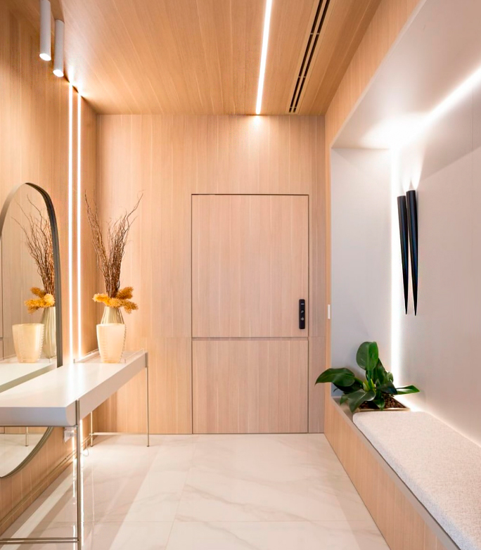 • hall de entrada com espelho em um lado e no outro um banco, perfim no teto e no espelho