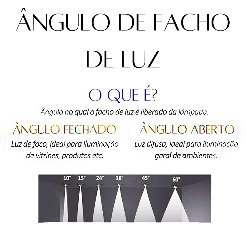Isso significa que, quando falamos em ângulo de iluminação, consideramos a abertura ou feixe de luz emitido e suas características, como abrangência e intensidade luminosa em LÚMENS.