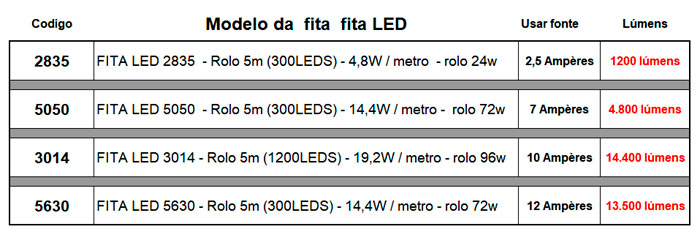 A fita 5630 foge um pouco a regra geral, pois ela ilumina muito pelo seu formato de LED e necessita de mais amperes para chegar no seu resultado de Alto Brilho.