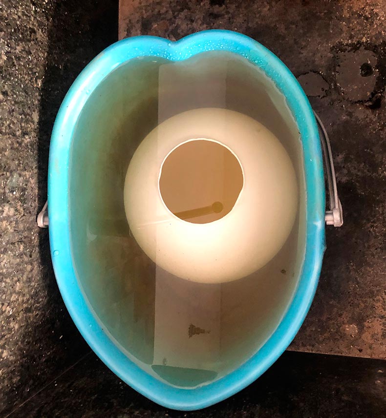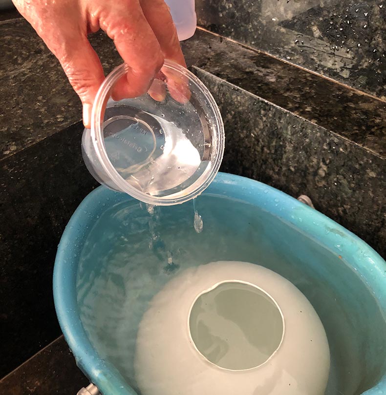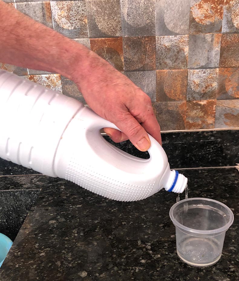 8. Coloque o vidro em um balde plástico com água até cobrir e despeje os 200ml de água sanitária ou cloro nele: