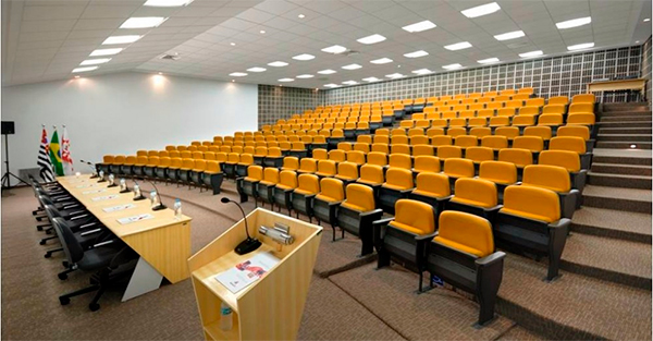 Se o auditório é para palestras e eventos em geral, a plateia tem que ter uma iluminação confortável para fazer anotações e interagir com os palestrantes.