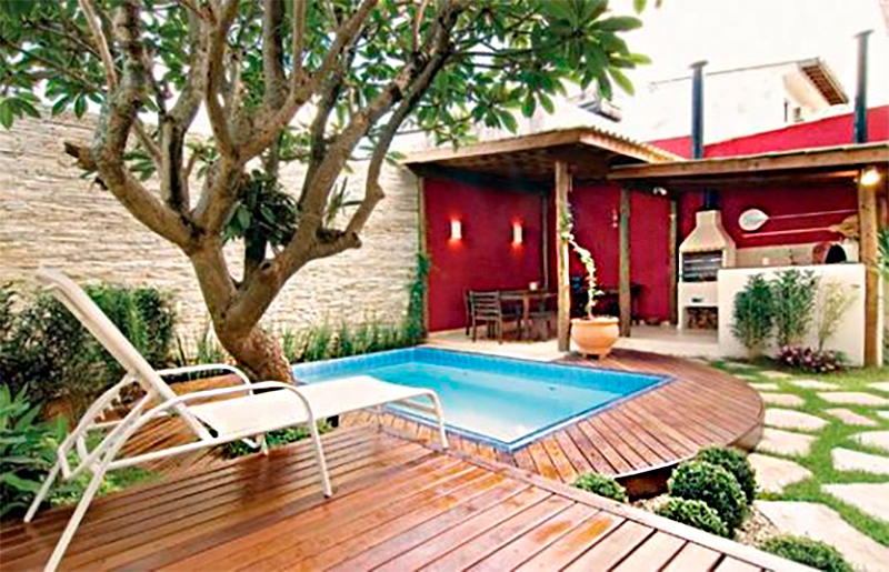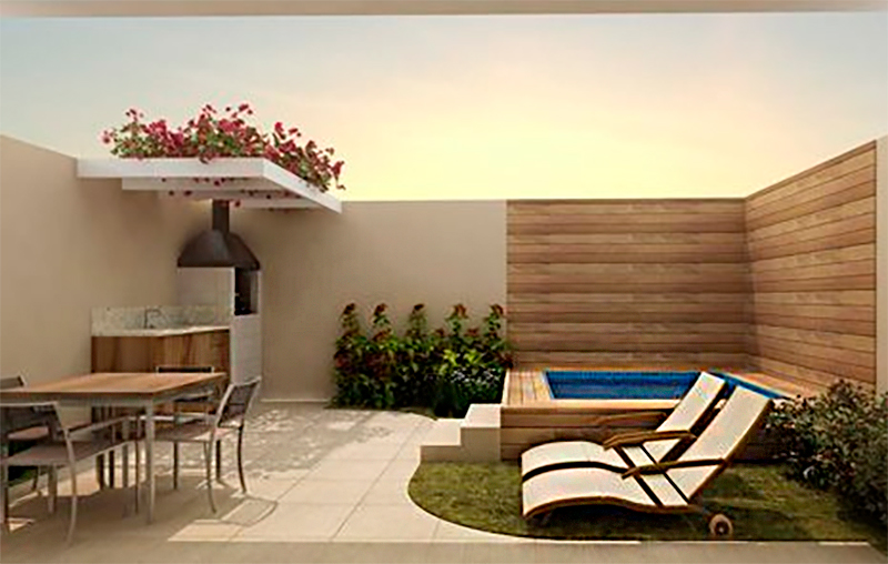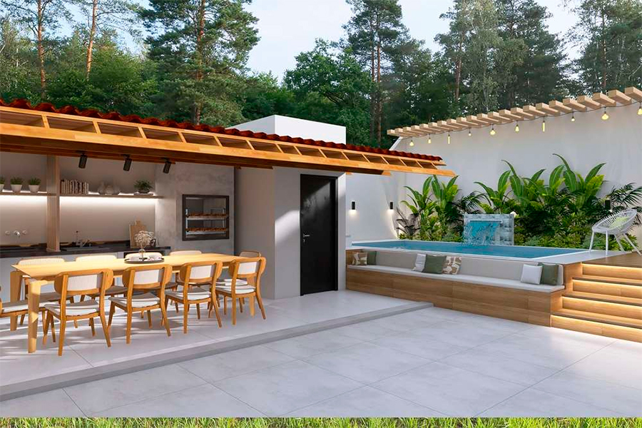 Você também pode escolher uma churrasqueira embutida, móveis minimalistas e iluminação LED para deixar o espaço mais futurista.