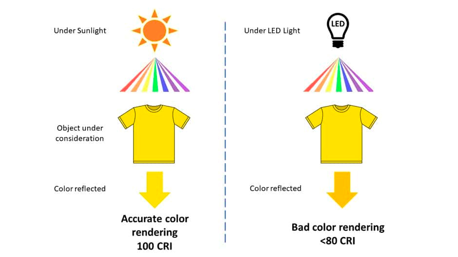 Para ser bem específico, o CRI é usado para descobrir a proporção da cor natural da fonte de luz indicada nas circunstâncias de qualquer fonte de luz branca artificial. No entanto, o CRI também é descrito com raios solares. Se o CRI de uma fonte de luz for 80 ou mais, então é considerado aceitável. Já o CRI de 90 é muito mais promissor que os anteriores.
