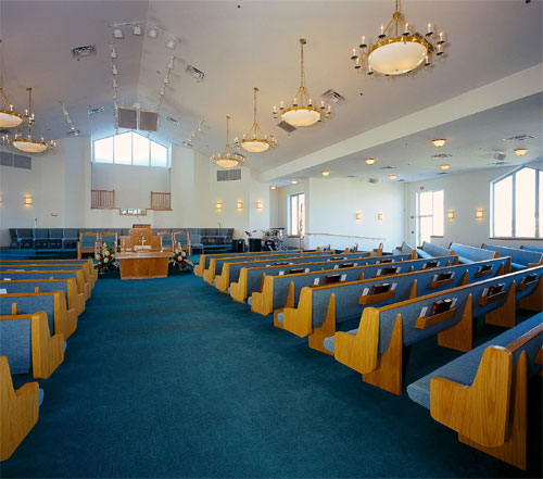 igreja tradicional com carpete azul. Há longas fileiras de bancos de madeira com assentos azuis, voltados para um altar de madeira no centro. Grandes lustres de teto e arandelas nas paredes oferecem iluminação. O fundo tem janelas triangulares altas.