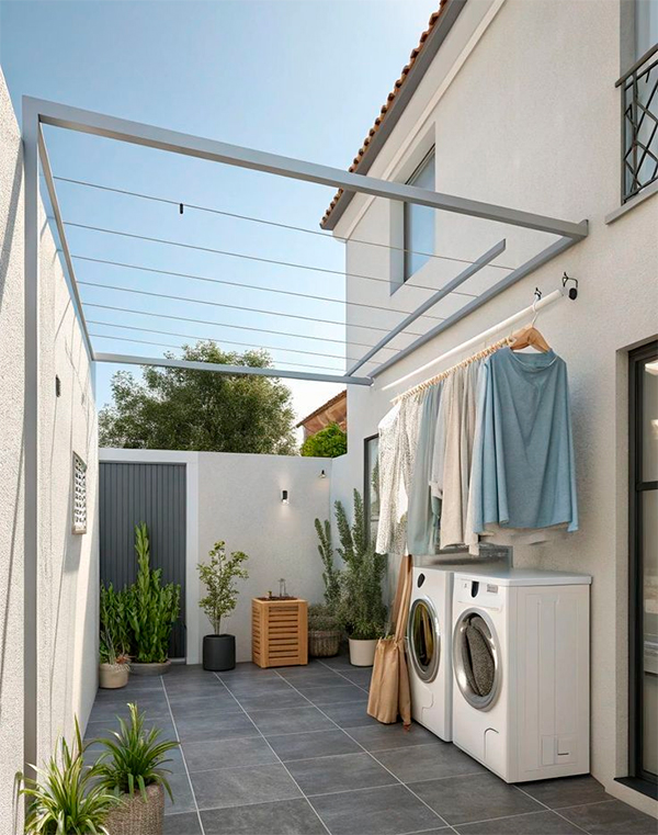 Uma lavanderia externa moderna e sofisticada. Ela tem piso claro e liso e uma bancada branca com armários superiores, onde fica uma máquina de lavar prateada e vasos de plantas. O teto é parcialmente coberto por uma estrutura de madeira. À esquerda, há uma parede de pedra clara e um pequeno jardim com seixos, lajes de concreto e vegetação, incluindo uma árvore. Roupas estão penduradas nas paredes. O ambiente é iluminado e aberto, com um ar de quintal.