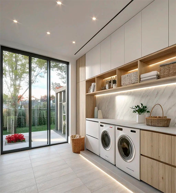 Uma lavanderia moderna e iluminada, com grandes portas de vidro que dão para um jardim. As paredes têm armários brancos e prateleiras abertas em madeira clara, com luzes LED. Há uma bancada de mármore claro com duas máquinas de lavar frontais embutidas. O piso é de azulejo claro. É um ambiente clean e sofisticado.