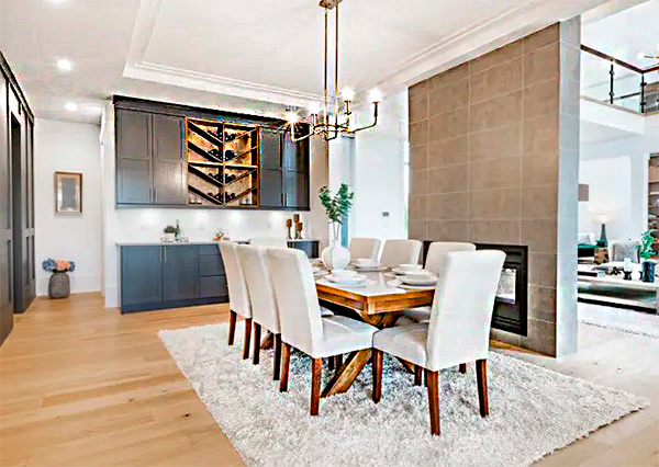 Uma sala de jantar elegante com piso de madeira clara. A mesa central, de madeira escura e ampla, é cercada por oito cadeiras estofadas em branco. Há um lustre moderno dourado. Na parede, um móvel escuro tem nichos para vinho e prateleiras. À direita, uma lareira com revestimento em tom de cinza.