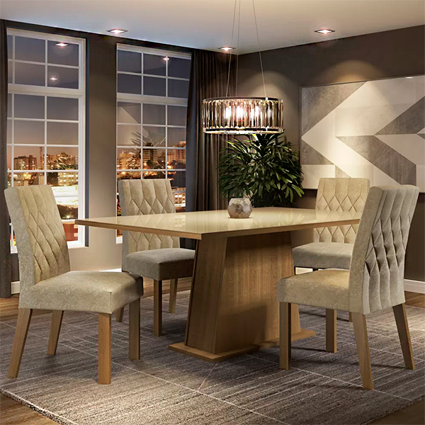 Um conjunto de sala de jantar moderno, com uma mesa quadrada de tampo claro e base de madeira. Há quatro cadeiras estofadas em tom bege claro com encosto detalhado. A iluminação é de um lustre suspenso e o ambiente tem paredes escuras e um carpete.