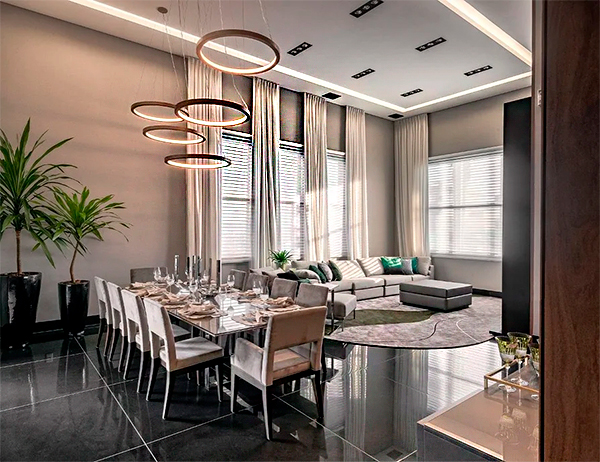 Um ambiente amplo, sofisticado, com sala de jantar e estar integradas. O piso é preto brilhante. A área de jantar tem uma mesa longa para doze pessoas sob lustres modernos de anéis metálicos. A sala de estar, ao fundo, possui um sofá em "L", tapete redondo, cortinas claras e muita luz natural. Tons neutros (cinza, bege, preto) dominam.