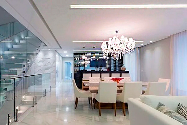 Esta é uma foto de um interior moderno, luxuoso e bem iluminado. Um lustre de cristal grande e brilhante pende sobre uma mesa de jantar branca retangular com cadeiras estofadas brancas. O piso é de mármore branco polido. À esquerda, há uma escada com guarda-corpo de vidro. Ao fundo, uma área de bar com iluminação sofisticada. A decoração é predominantemente branca e clara.