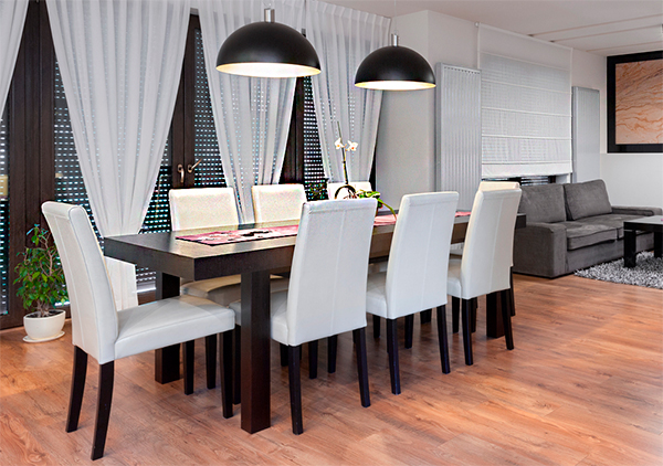 É uma sala de jantar moderna. Uma mesa retangular escura com oito cadeiras estofadas brancas ocupa o centro. Acima, pendem duas luminárias pretas em formato de cúpula. O chão é de madeira clara. Ao fundo, uma grande janela está coberta por cortinas brancas translúcidas, e uma sala de estar com um sofá cinza é visível à direita.