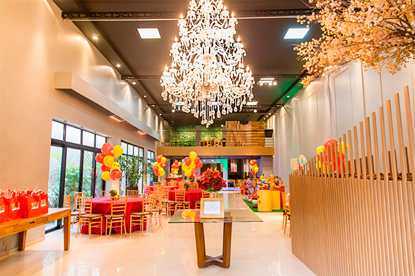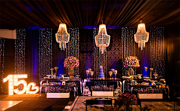 Iluminação Decorativa: Adicione elementos de iluminação decorativa no salão de festas, como lustres, pendentes, arandelas ou cordões de luz, para criar um ambiente festivo e aconchegante.
