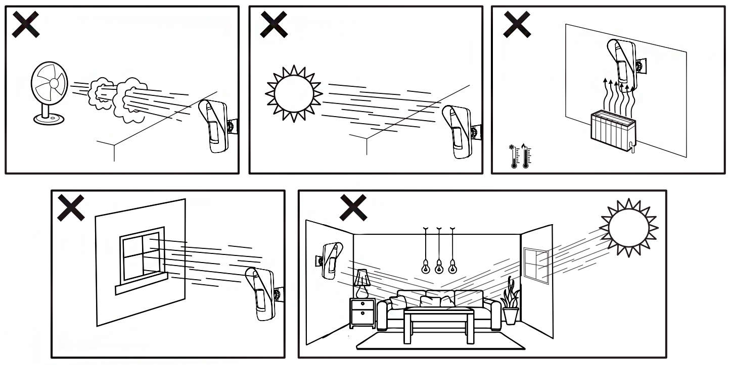• Não instale o sensor em locais que ocorrem alterações bruscas de temperatura. Evite instalação próxima a equipamentos de ar-condicionado, aquecedores, ventiladores, refrigeradores, fornos ou em locais que possam gerar reflexos;