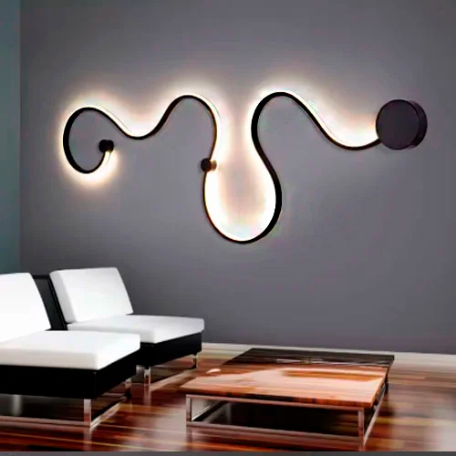 luminária de parede moderna, fixada numa parede cinza escura. Ela tem um formato ondulado e orgânico, como um rabisco abstrato alongado.