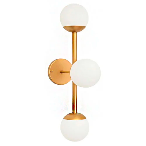 Arandela dourada elegante Uma luminária de parede (arandela) vertical com acabamento dourado fosco. Possui três cúpulas esféricas de vidro fosco branco, dispostas em linha vertical no centro. A peça central de montagem é um disco dourado fixado na parede. É um design moderno e sofisticado.
