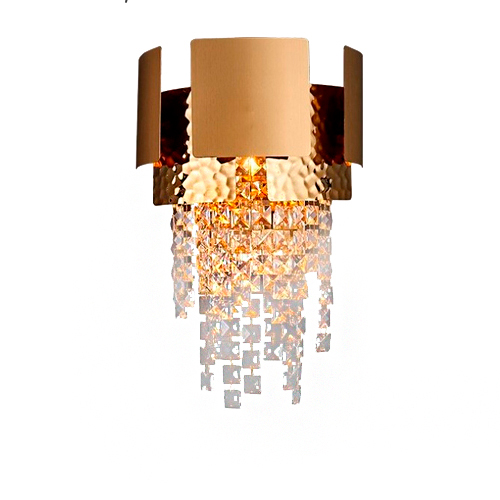 Essa é uma arandela de parede luxuosa. Tem uma estrutura em metal dourado martelado e polido, com placas curvas ao redor. Na parte inferior, possui várias cascatas de cristais facetados que brilham e dispersam a luz da lâmpada interna