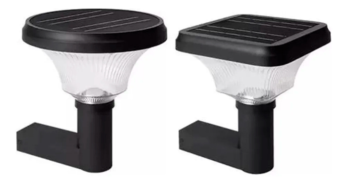 A imagem mostra duas luminárias solares de parede, na cor preta. Ambas possuem uma base em 'L' para fixação. A luz é emitida por um corpo transparente em formato de sino invertido. O que as diferencia é a placa solar no topo: a da esquerda é redonda e a da direita é quadrada