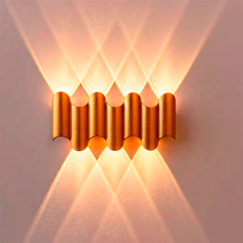 Uma arandela de parede (luminária) dourada, com formato de ondas ou tubos lado a lado. Ela emite luz, quente e suave, para cima e para baixo. A luz forma um design elegante de dois "X" na parede, destacando a textura ondulada da peça e criando um efeito decorativo e acolhedor.