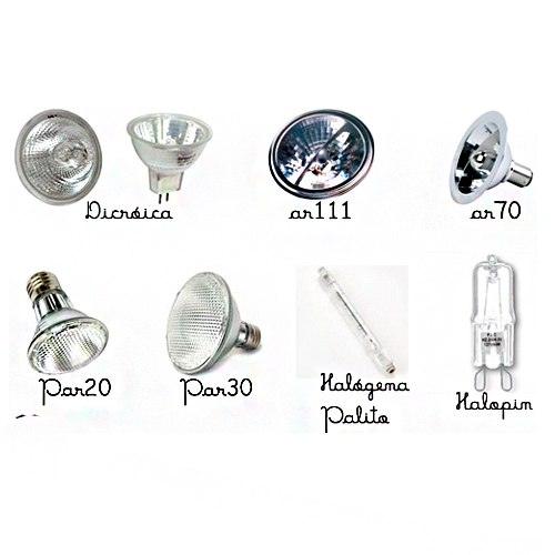 Exemplos: Palito ou Lapiseira, PAR 20,30, 38, Halopin, Bipino, Dicroica e Mini Dicroica, AR 48, 70, 111
