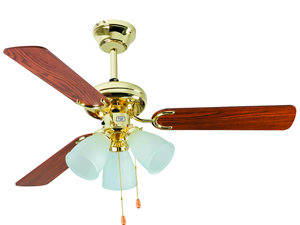 Esta é a imagem de um ventilador de teto com um acabamento dourado brilhante no motor e na haste. Possui quatro pás em tom de madeira escura. Na parte inferior, há um conjunto de luzes com três cúpulas de vidro fosco, penduradas por correntes de puxar para controle. É um modelo clássico e decorativo