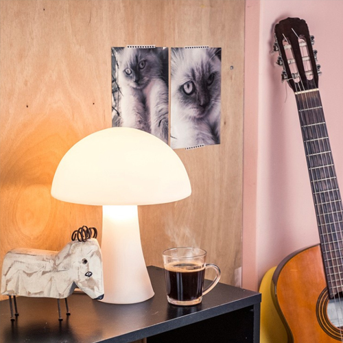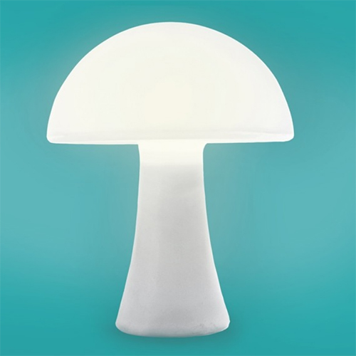 Lindo abajur com visual clean lembrando o formato de um cogumelo. Luz com estilo e descontração.