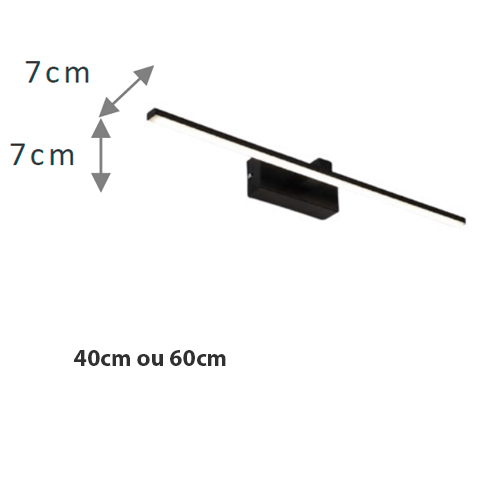 Arandela FRAME está disponível em duas opções de tamanho: 40 cm com potência de 6 watts e 60 cm com potência de 9 watts. Essas opções permitem escolher a que melhor se adequa às necessidades de iluminação do ambiente.