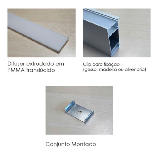 Material: Corpo em alumínio extrudado, Difusor translúcido em PMMA extrudado