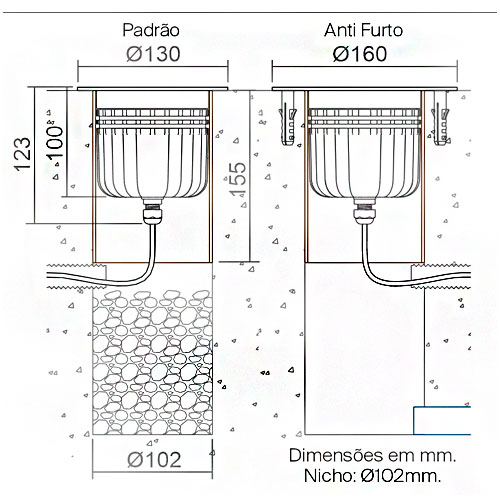 Descrição: Embutido de solo LED com aro parafusado ao solo para dificultar o furto da luminária.