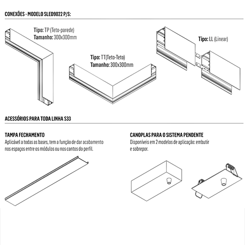 A Base Sistema Modular Sobrepor S33 é perfeita para realçar a iluminação de closets, escadas, hall de entrada e mobiliários embutidos, criando uma atmosfera sofisticada e acolhedora. Em ambientes comerciais, ela oferece um toque moderno e elegante, ideal para destacar a decoração e proporcionar conforto visual.