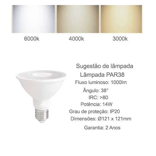 Lâmpada: 1x LED ou Eletrônica, Par 20, 30 ou 38 – Branco Quente (3000K) ou Branco Frio (6000K). (NÃO INCLUSO)