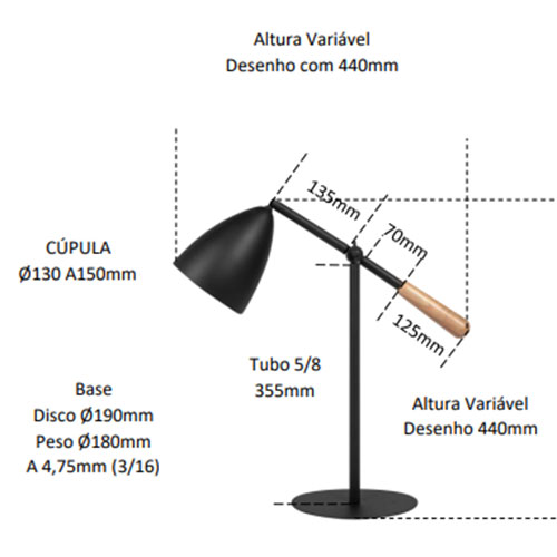Com dimensões de C44 x A44cm, a Luminária de Mesa Serena Conic possui uma estrutura variável que se ajusta facilmente ao ambiente em que é colocada. A cúpula tem Ø13 x A15cm, proporcionando uma iluminação suave e direcionada.