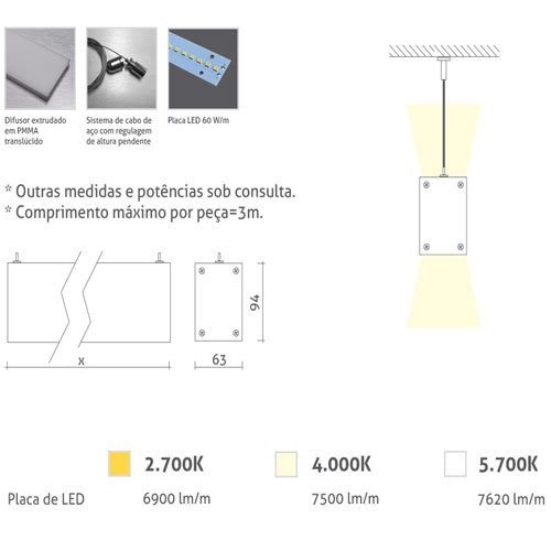 Potência: 2x 30w/M LED – 2700K / 4000K / 5700K (INTEGRADO)