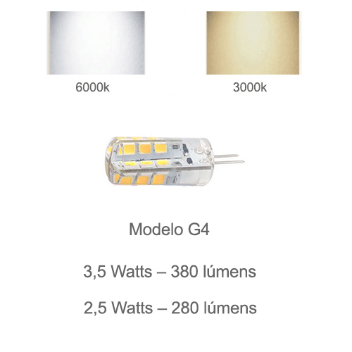 Lâmpada: 32x G4 – Branco Quente (3000K) ou Branco Frio (6000K).