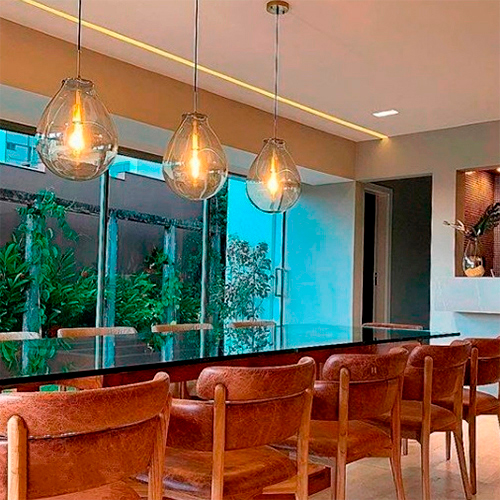 Com sua mistura de metal e vidro, o Pendente CAJU cria uma iluminação suave e agradável que adiciona um toque de elegância e modernidade ao ambiente. É uma excelente opção para quem busca um lustre versátil e sofisticado para complementar a decoração de sua casa.
