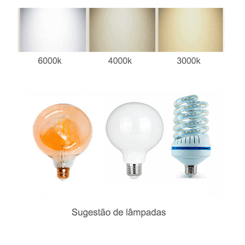 Lâmpada: 1x LED ou Eletrônica – Branco Quente (3000K), Branco Neutro (4000K), Branco Frio (6000K). (NÃO INCLUSO)