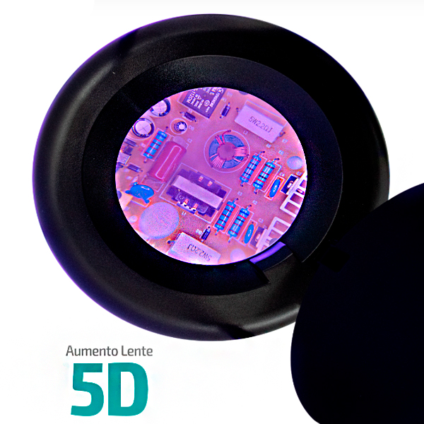 A lente com aumento de 5D (dioptrias) é ideal para trabalhos que requerem uma ampliação e visão mais precisa e imagem mais ampla de toda superfície observada na lente de 127mm.