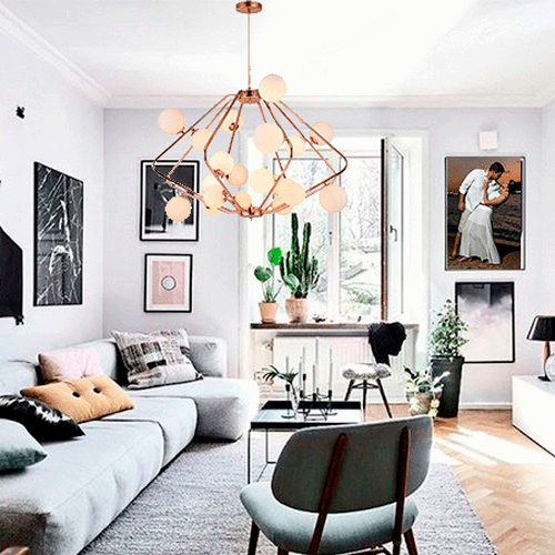 Modelo: Lustre Moderno Jabu Rosê com 20 Globos de Vidro Leitoso