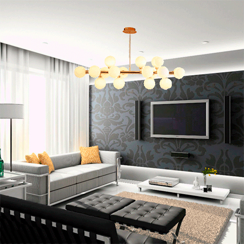 Modelo: Lustre Moderno Long Rosê com 16 Globos de Vidro Leitoso