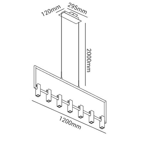 O Pendente Sky Possui uma moldura retângular que engloba os 7 pontos de iluminação que em seu corpo possuem acabamento na cor ouro envelhecido, com acabamento em alumínio disponível na cor quente 3000K