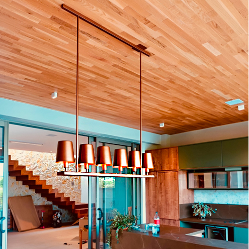 Outro ponto a destacar é a atmosfera que o lustre cria. Diferente de luminárias convencionais, ele não apenas ilumina, mas também adiciona personalidade ao espaço. A luz projetada se distribui de forma equilibrada, trazendo conforto visual sem perder intensidade. Isso o torna perfeito para composições que buscam valorizar detalhes arquitetônicos ou elementos de decoração, como móveis planejados, mesas de jantar e painéis. Além disso, é um recurso decorativo que ajuda a delimitar áreas em projetos de conceito aberto, criando pontos de iluminação estratégicos.