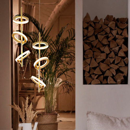 - Cores: O acabamento em pintura dourado polido confere elegância e versatilidade ao Pendente AANILLO Vertical, permitindo que ele se integre harmoniosamente a diversos estilos de decoração.