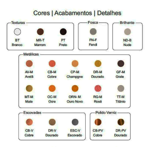 Disponível nas Cores: Preto / Branco / Marrom / Nude / Fendi(Cinza) / Cobre / Prata / Escovado / Dourado / Mais sob consulta..