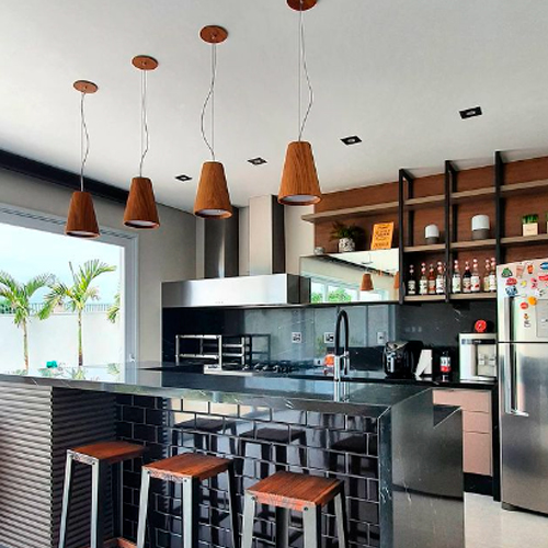 A peça apresenta uma versatilidade que permite a sua aplicação em diferentes estilos decorativos, desde ambientes mais rústicos, que combinam com as tonalidades naturais da madeira, até decorações modernas e minimalistas. Disponível em opções de cores que remetem aos tons quentes e elegantes da madeira, como Imbuia e Freijó, este pendente se adapta a várias paletas de cores e propostas decorativas, proporcionando uma atmosfera acolhedora e charmosa.