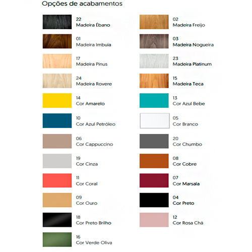 Acabamento: Madeira: Pinus- Freijó – Imbuia – Arauco – Teca – Nogueira – Cúmaru – Marsala – Cappuccino – cores sob encomenda.