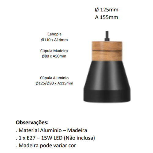 Lâmpada: 1x LED – Branco Quente(3000K) ou Branco Frio(6000K) (NÃO INCLUSO)
