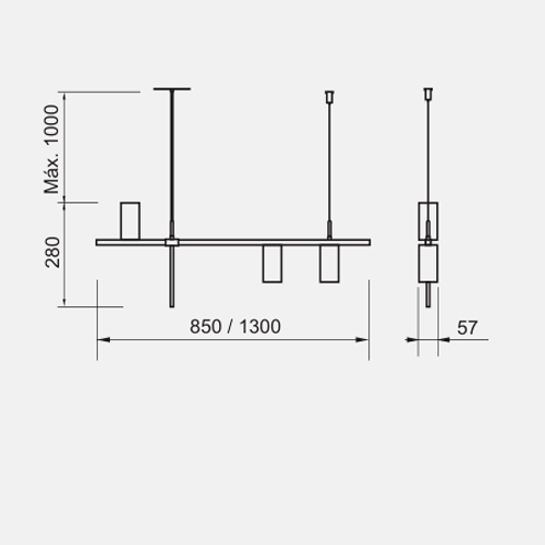 Disponível em duas opções de tamanho – 57X850X280 com 3 MR11 e 57X1300X280 com 4 MR11 – o Pendente Sonda se adequa perfeitamente a diferentes espaços. Além disso, a peça pode ser deslocada conforme necessário, permitindo ajustar a posição de iluminação de acordo com o layout do ambiente.