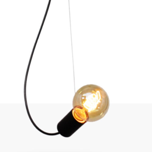 O diferencial desse pendente fica por conta do cabo de aço que sai da canopla e vai até o copo aonde a lâmpada será rosqueada. Dependendo da altura que o fio de aço é preso, a lâmpada fica virada para cima ou para baixo, criando um efeito flutuante.