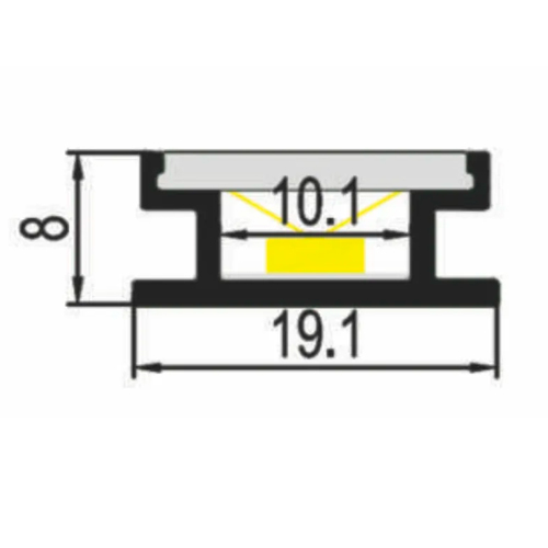 Perfil embutir 19,20mm  pode escolher a tensão de operação entre 12v, 24v, 110v ou 220v, com a opção de usar um driver externo ou conectá-lo diretamente à rede elétrica. As dimensões compactas de 0,8cm de altura por 1,9cm de largura, disponíveis em barras de 1 ou 2 metros, facilitam a instalação em diversos projetos.