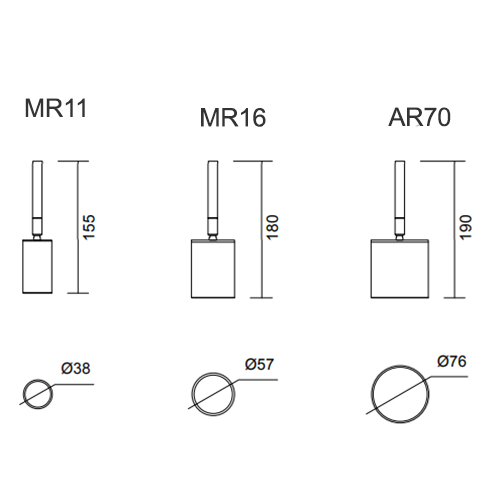 Spots Direcionáveis: Os spots direcionáveis estão disponíveis em três tamanhos com diferentes lâmpadas, variando de 1x MR11 a 1x AR70. As dimensões variam de 3,8cm a 7,6cm de diâmetro e de 17,5cm a 19cm de altura. O soquete utilizado é o GU10.