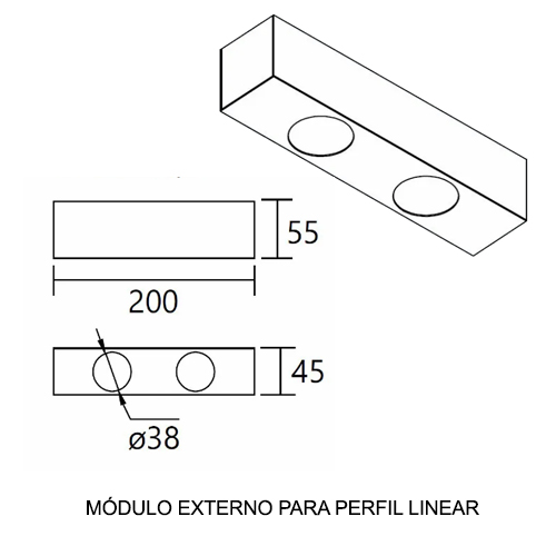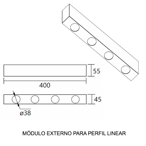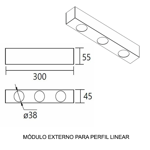 Módulo Extrato c/ Mini: Para o módulo extrato com mini lâmpadas MR11, as dimensões variam de 10cm a 40cm de comprimento, com uma altura de 5,5cm e uma largura de 4,5cm. O soquete utilizado é o GU10.